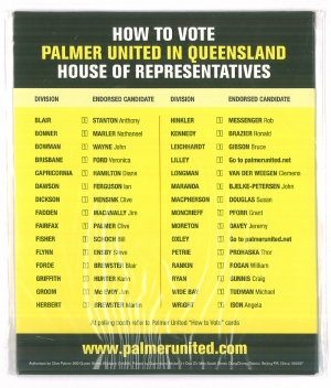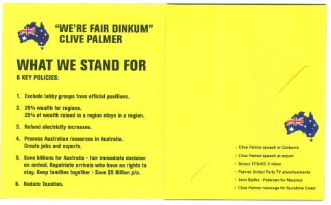 Vote For Palmer United, We're Fair Dinkum. Senate Vote 1 Glenn Lazarus. 6 Key Policies. Free Titanic 2 DVD inside.