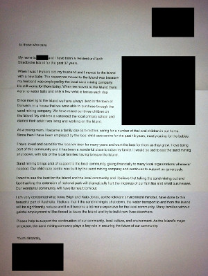 [CENSORED] has been a resident of Stradbroke Island for 37 years. The Stradbroke Is community will have its heart torn out by stopping sand mining and increasing the size of the national park.